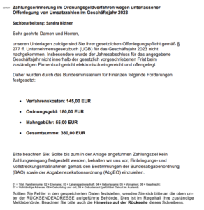Leider kommt es aktuell vermehrt zu Fake Nachrichten, bei denen angebliche Zahlungsaufforderungen vom Bundesministerium für Finanzen verschickt werden. Die Schreiben sind täuschend echt. Das BMF würde jedoch Schreiben immer mit Ihrer Steuernummer versehen und verwendet auch keinen ausländischen IBAN, wie dies auf den gefälschten Mitteilungen der Fall ist.