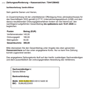 Wir raten dringend davon ab, Zahlungen aufgrund solcher Schreiben zu leisten. Öffnen Sie keine enthaltenen Links und übermitteln Sie keinesfalls persönliche Daten.